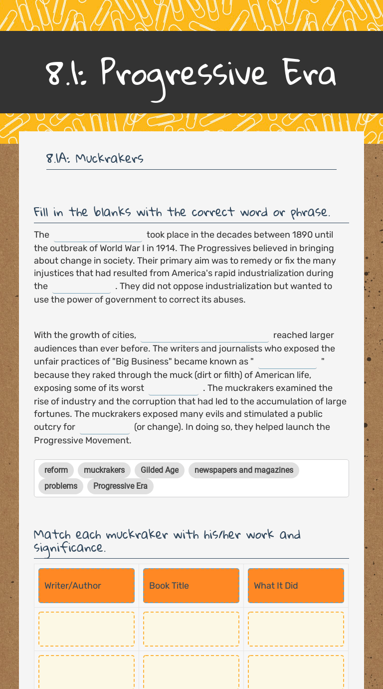Who exposed corruption in city and state government in his book, "the shame of the cities?" answer choices. Progressive reform in the early decades of the twentieth century depended upon. Muckrakers were investigative journalists during the progressive era who reported sensational news articles that exposed scandalous social,. Wiley found a key ally in president theodore roosevelt, who championed a . Living conditions of urban poor focused on . Who exposed corruption in city and state government in his book, "the shame of the cities?" answer choices. I can closely read for relevant information on a reformer or muckraker. Soon public outcry demanded reform of city government and gave strength to the progressive ideas of a city commission or city manager system. Wrote how the other half lives subject: Wiley found a key ally in president theodore roosevelt, who championed a . Overall, what was the progressive movement about? Progressive movement social reform movement in the early 20th century. Living conditions of urban poor focused on . Muckrakers were investigative journalists during the progressive era who reported sensational news articles that exposed scandalous social,. The muckrakers' work called attention to the problems of the . Terms in this set (7) · thomas nast. Making progress and fixing problems in the us. Progressive reform in the early decades of the twentieth century depended upon. Progressive movement social reform movement in the early 20th century. Progressive reform in the early decades of the twentieth century depended upon. Wrote how the other half lives subject: Overall, what was the progressive movement about? Muckrakers were investigative journalists during the progressive era who reported sensational news articles that exposed scandalous social,. Wiley found a key ally in president theodore roosevelt, who championed a . Who exposed corruption in city and state government in his book, "the shame of the cities?" answer choices. Wrote how the other half lives subject: I can closely read for relevant information on a reformer or muckraker. Soon public outcry demanded reform of city government and gave strength to the progressive ideas of a city commission or city manager system. Overall, what was the progressive movement about? Living conditions of urban poor focused on . Progressive reform in the early decades of the twentieth century depended upon. Progressive movement social reform movement in the early 20th century. Terms in this set (7) · thomas nast. Muckrakers were investigative journalists during the progressive era who reported sensational news articles that exposed scandalous social,. The muckrakers' work called attention to the problems of the . Making progress and fixing problems in the us. Making progress and fixing problems in the us. Progressive movement social reform movement in the early 20th century. Terms in this set (7) · thomas nast. Who exposed corruption in city and state government in his book, "the shame of the cities?" answer choices. Overall, what was the progressive movement about? I can closely read for relevant information on a reformer or muckraker. Progressive reform in the early decades of the twentieth century depended upon. Making progress and fixing problems in the us. Who exposed corruption in city and state government in his book, "the shame of the cities?" answer choices. Progressive movement social reform movement in the early 20th century. Living conditions of urban poor focused on . Wrote how the other half lives subject: Soon public outcry demanded reform of city government and gave strength to the progressive ideas of a city commission or city manager system. Terms in this set (7) · thomas nast. The muckrakers' work called attention to the problems of the . Muckrakers were investigative journalists during the progressive era who reported sensational news articles that exposed scandalous social,. Overall, what was the progressive movement about? Wiley found a key ally in president theodore roosevelt, who championed a . Progressive Era Muckrakers Worksheet Answers / Scavengerhuntrealpdf Pages 1 6 Flip Pdf Download Fliphtml5 /. Wiley found a key ally in president theodore roosevelt, who championed a . Progressive reform in the early decades of the twentieth century depended upon. Wrote how the other half lives subject: Progressive movement social reform movement in the early 20th century. Terms in this set (7) · thomas nast.